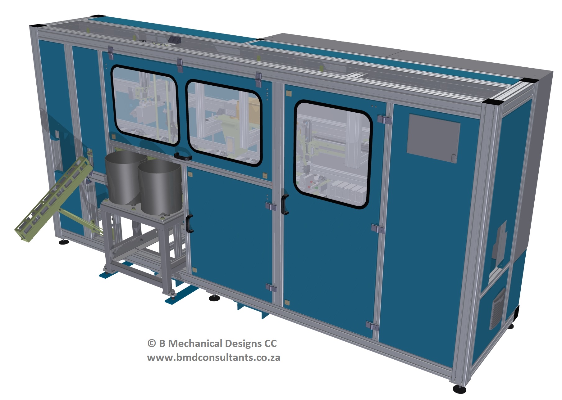Project Description: This plant assists in the assembly of the ECM’s. The conveyors supply the assembly operators with ECM’s as they are processed and assembled. The machine shown here (blue panels) preforms the following automatic processes to the almost complete ECM’s: 1. loads ECM’s into itself using an integrated transfer gripper system. 2. Bar-code scan and performs com’s verification. 3. Laser marking with air extraction. 4. Laser marking and com’s verification. 5 Final sealing of ECM with dual rivet insertion. Rivets supplied by two vibratory bowel feeders. 6. High current test in isolated environment. 6. Rivet confirmation and reject if ECM’s fail. 7. Off-load.