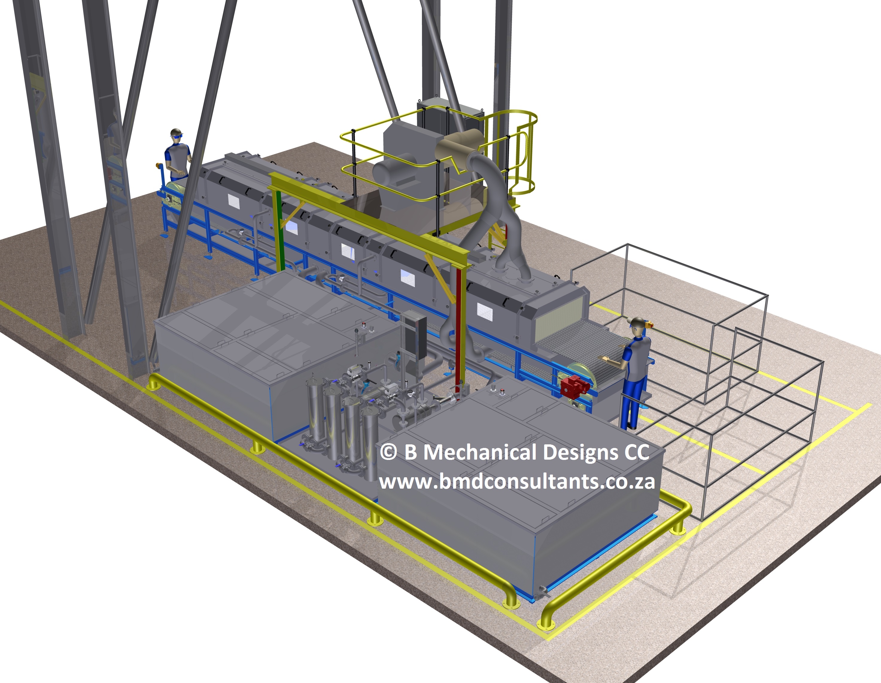 The system: Industrial belt type washing machine. Parts are fed in the one end and exit on the other. Whist traveling through the wash plant, these components are washed, rinsed and dried using carefully selected nozzles and nozzle configurations and blow-off. Each area is compartmentalized to limit carry-over of wash and rinse fluids. Both the wash and rinse tanks are heated to assist in removing the oils. An industrial blower assists with part blow-off, feeding four air-knives. All water is filtered and reused.