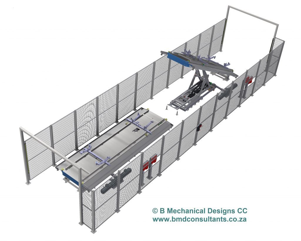 This station consists of two opposing tilt stations. The tilt station consists of a roller conveyor with a custom designed body and skid clamping mechanism. This arrangement is tilted using a single arm scissor lift. The objective of the station is to remove unwanted wax from the vehicle bodies.